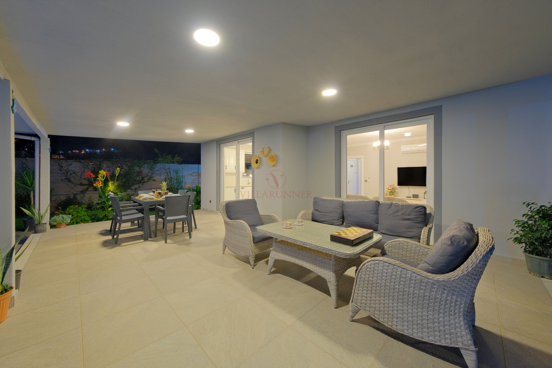 Inside, the villa features a bright living room, a fully equipped kitchen, comfortable bedrooms, and modern bathrooms. The living area is furnished with a cozy seating group, TV, air conditioning, and high-speed internet access.
