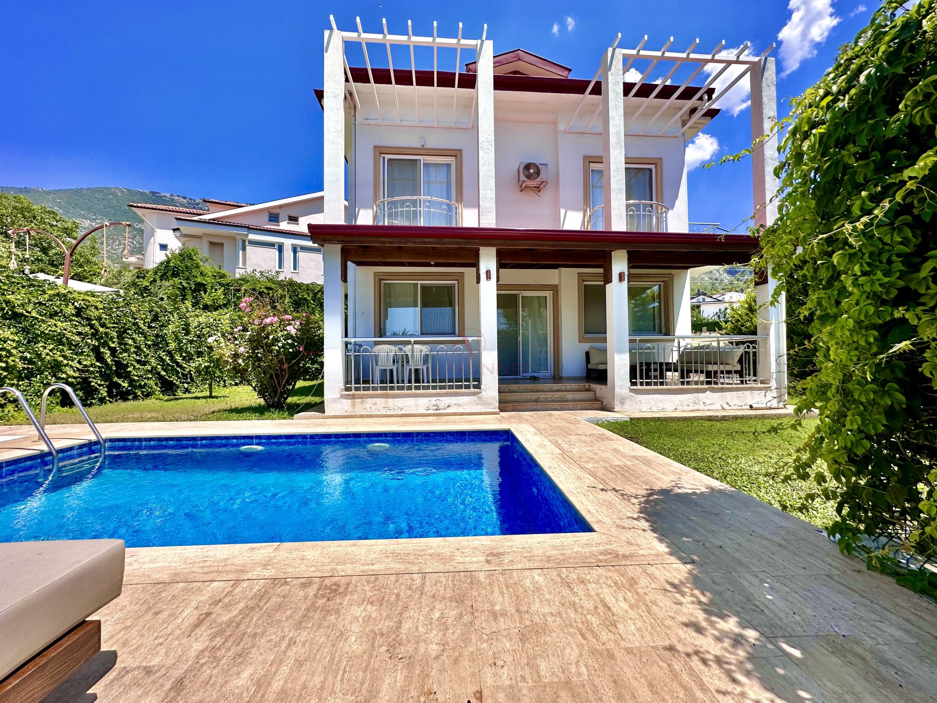 Villaya ait özel yüzme havuzu, güneşlenme alanı ve keyifli bir bahçe alanı bulunmaktadır. Gün boyu havuz başında dinlenebilir, akşam saatlerinde ise sevdiklerinizle birlikte bahçede vakit geçirebilirsiniz.